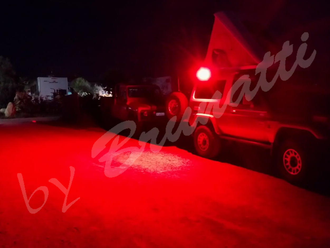 Faro da campo a intensità variabile con led a due colori selezionabili: luce bianca per atmosfera e luce rossa anti-insetti.